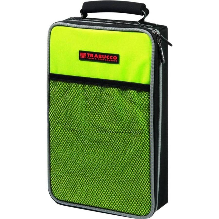 Trabucco besteedt er expliciet aandacht aan om het volledige palet aan benodigdheden voor de visserij aan de vissersgemeenschap te bieden. De familie van XTR-accessoires omvat uitgesproken kwaliteitsproducten.De uniforme kleurcombinatie van de producten maakt ze goed onderscheidend op de markt.Kenmerkend is ook het verfijnde en hoogwaardige materiaalgebruik (bijv. waterdicht en wasbaar 1200 denier, kwaliteitsritsen en klittenbandsluitingen)Deze onderlijn tas is iets meer dan alleen een onderlijn tas.Aan de binnenkant van het met rits afsluitbare deksel bevinden zich 2 praktische vakken voor het opbergen van kleine en platte voorwerpen. Hier is ook ruimte voor langere gereedschappen (bijv. kleine gereedschappen, scharen, enz.), die op hun plaats worden gehouden door een brede elastische band.Het hoofdopbergvak is in tweeën gedeeld. De ene helft bevat 6 stuks 3-spoels spoeltjes, waarop onderlijnen van vrijwel elke lengte kunnen worden opgeborgen. Het bevestigen van de onderlijnen wordt verzorgd door korte spelden met plastic uiteinden.In het andere deel liggen 6 kleinere, transparante opbergdozen van plastic.