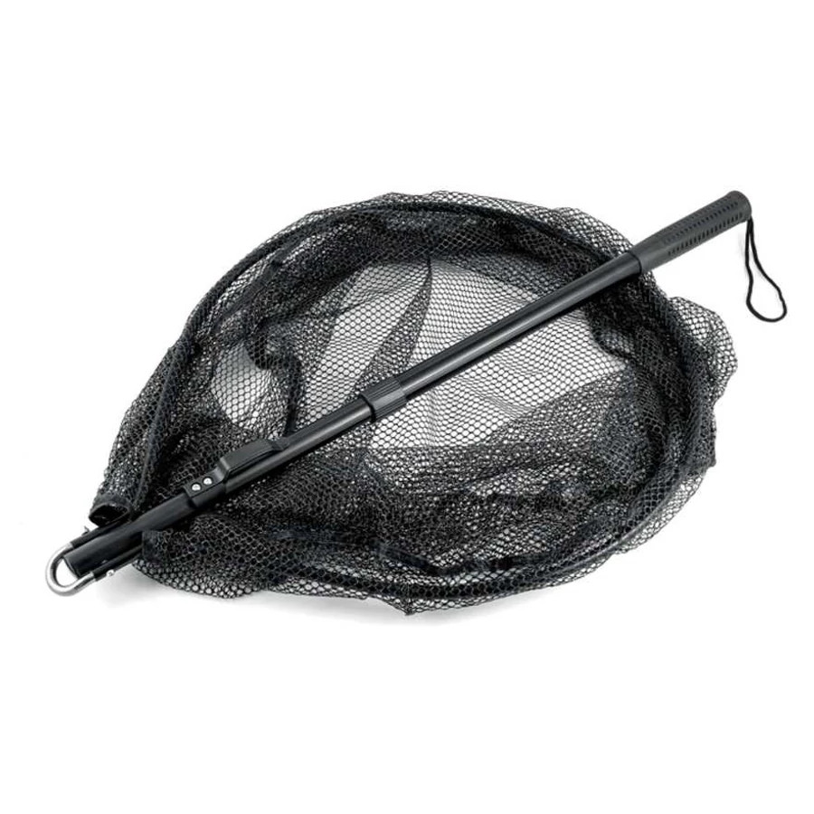 Schepnet met een zwart net, waarvan het materiaal rubber is. Dit is veel zachter voor de vissen. Bovendien is het gemakkelijk schoon te maken en droogt het snel, zodat u geen last heeft van onaangename geuren.De steel is tweedelig en kan in het bereik van 65-110cm op elke gewenste lengte worden ingesteld.Aan de steel zit een haak om het schepnet aan de riem te hangen, waardoor je je handen vrij hebt, wat erg handig is tijdens het vissen en ook als je door een dichtbegroeid gebied naar de waterkant moet.