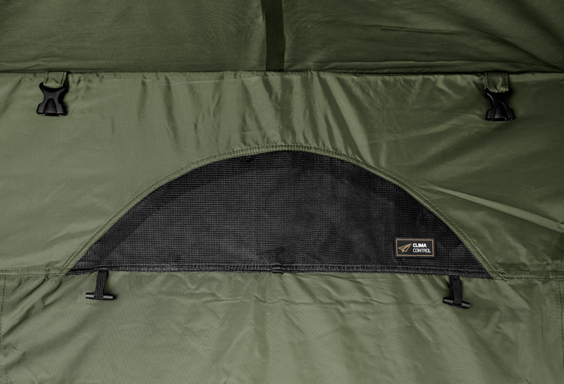 Bij het YURTA NEO model hebben we gedacht aan betere ventilatie en hebben we ons eigen ontworpen CLIMA CONTROL systeem ingebouwd. Dit systeem bestaat uit twee ventilatieopeningen aan tegenovergestelde zijden (boven de ingangsdeur en het achterraam). Dankzij dit doordachte systeem kan de toevoer van frisse lucht worden gewaarborgd, zelfs als de grote ramen niet kunnen worden geventileerd.U zult het zeker waarderen, vooral 's nachts, wanneer het de condensatie vermindert. Het hele systeem is eenvoudig vanuit de tent te bedienen.