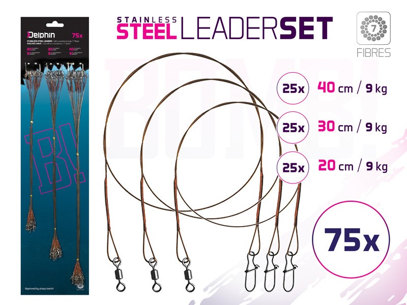 Delphin Set BOMB! stalen onderlijn met karabijnhaak/7 strengen (75x /20,30,40cm/9kg)