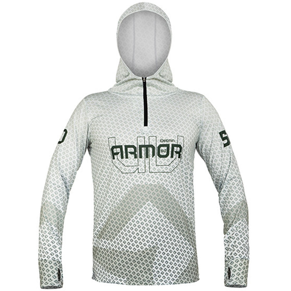 Het Delphin UV Armor 50+ Neon Hooded Longsleeve T-shirt biedt perfecte bescherming tegen de zon op zomerse dagen. Het UPF 50+ beschermende materiaal beschermt je huid tegen zonnebrand en voelt zelfs op de warmste dagen koel aan. Omdat ons hoofd erg snel kan oververhitten, heeft de top een hoge kraag en capuchon. Bovendien zijn de mouwen extra lang en voorzien van duimlussen om ook de handen te beschermen. Het is gemaakt van zacht elastisch materiaal dat snel droogt als het nat wordt tijdens het vissen. Zowel de top als de print erop zijn van hoge kwaliteit. Materiaal: 90% polyester, 10% elastaan.