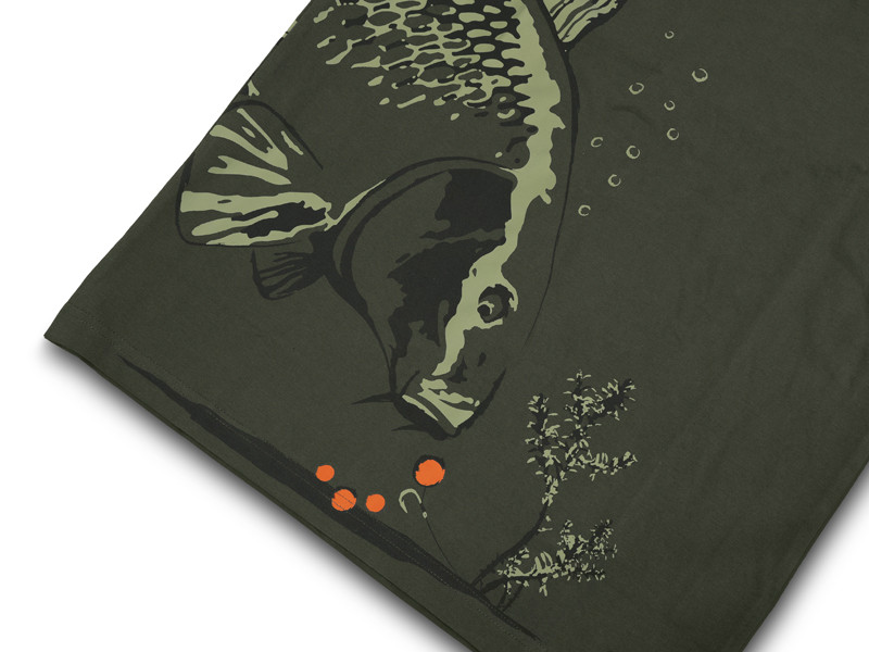 De CATCH ME IF YOU CAN-serie met karperdesign is niet zomaar een opvallend item in de visgarderobe. Het karpermotief omringt het onderste deel van het lichaam en verschijnt als schets of schilderij, waarbij alle essentiële details behouden blijven. De vis nadert net een handvol boilies – dit is precies het moment waar vissers op wachten. Het T-shirt is gemaakt in donkergroene kleur, met opvallende oranje en lichtgroene graphics.