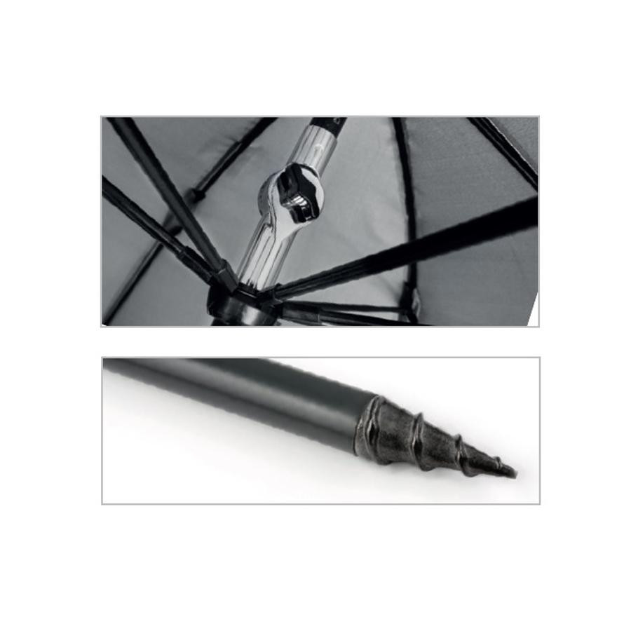 Dankzij de gelaste naden is de paraplu volledig waterdicht, wat betrouwbare bescherming biedt bij lichte regen. Met behulp van het versterkte bevestigings- en hoekverstellingsmechanisme kan de paraplu in de gewenste hellingshoek worden gezet en stabiel in de grond worden bevestigd. De meegeleverde ringen, bevestigingspennen en touwen zorgen ervoor dat de paraplu zelfs bij extreme weersomstandigheden op zijn plaats blijft. Met de lichtere materialen in plaats van staal is de paraplu gemakkelijk te dragen, zonder concessies te doen aan duurzaamheid of betrouwbaarheid.