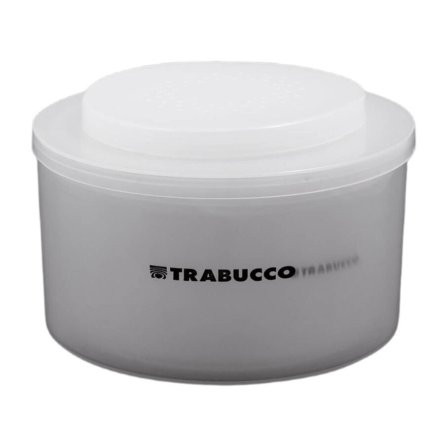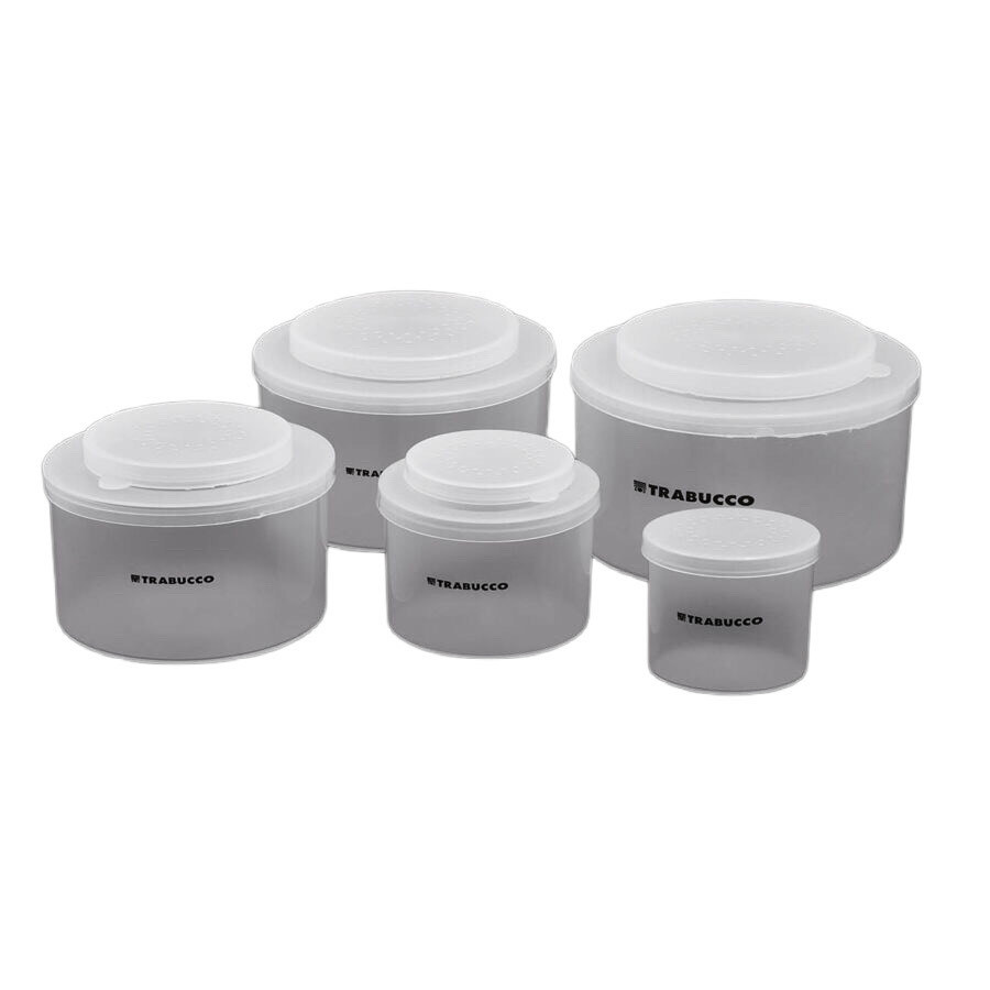 Aasdoos set, bestaande uit vijf afsluitbare dozen. De geperforeerde deksels zorgen voor een adequate luchttoevoer naar het aas. Een ander kenmerk is dat het midden van het deksel ook geopend kan worden (met uitzondering van de kleinste doos), zodat maden, wormen, enz. er niet uit kunnen kruipen, en het hele deksel kan ook worden verwijderd. Het opbergen is zeer eenvoudig; de grootste biedt plaats aan alle andere.