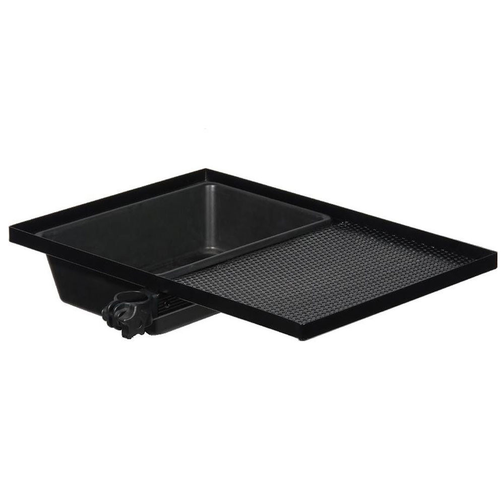 De zijtafel met een oppervlakte van 51x36 cm heeft aan één kant een diepe bak, die niet alleen ideaal is voor het bewaren van aas, gereedschap of andere kleine accessoires, maar waarin ook water kan worden gedaan, zodat je je handen schoon kunt houden tijdens het vissen – een kleine, maar geweldige oplossing om het viscomfort te verhogen. De geperforeerde bodem van de bak helpt overtollig water af te voeren, zodat er niets in blijft staan, het snel droogt en er geen nat, onaangenaam oppervlak ontstaat. De rand is zorgvuldig ontworpen om gereedschap veilig op zijn plaats te houden, waardoor per ongeluk vallen wordt voorkomen, wat vaak tot frustratie leidt aan de waterkant.