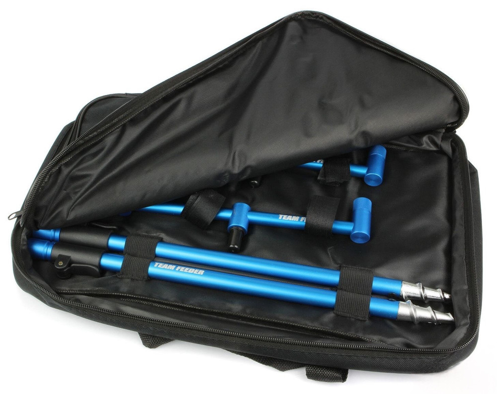 Het assortiment van By Döme producten wordt voortdurend uitgebreid, daarom presenteren wij met plezier dit nieuwe praktische hulpmiddel.Waarschijnlijk de meest veelzijdige tweestokkenset op de markt. Praktisch, lichtgewicht en compact. Deze set bevat 2 stuks 22 cm brede buzz bars, evenals 2 stuks 40 cm schroefdraad grondpinnen. Omdat het handvat een telescopisch systeem heeft, kan de lengte natuurlijk worden verlengd, in dit geval zelfs tot 60 cm. De hoogwaardige aluminium grondpin met metallic blauwe afwerking en extra sterke punt is gemakkelijk in de grond te schroeven. De snelle en eenvoudige verstelbaarheid van de steel wordt gewaarborgd door een gespverbinding. Op de dwarsbalken bevindt zich een positionerings-tegenschoef, waarmee de stand van de hengelhouders praktisch en snel kan worden ingesteld.Inhoud van het pakket: 1 stuk By Döme TEAM FEEDER Hengelhouder Set met Tas