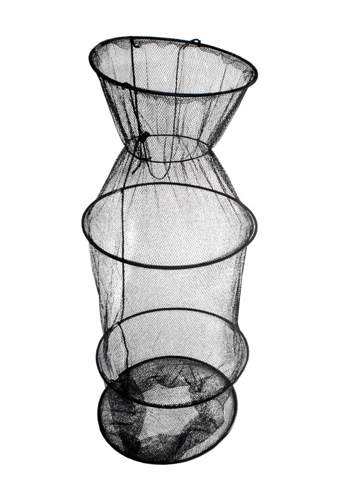Het bovenste deel kan onder de eerste ring worden samengebonden met een praktisch koord, zodat de geplaatste vissen er moeilijker uit kunnen ontsnappen. Bovendien, als het water ver weg is of de oeverzone ondiep, kunnen we het verder het water in plaatsen en zelfs volledig onderdompelen.