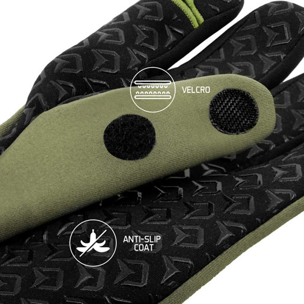 Deze spinhandschoen houdt onze handen warm, zelfs onder de koudste weersomstandigheden. Spinhandschoen van neopreen materiaal, met een gerubberde antislip laag op de handpalm, maakt een stevige grip mogelijk. De afneembare uiteinden aan de duim en wijsvinger vergemakkelijken het gemakkelijk vastpakken van kleine voorwerpen. Om kou en water buiten te houden, zijn de afdichtingen gemaakt van ingenaaid rubber. Het klittenband bij de pols en het gerubberde polsgedeelte maken het comfortabel om te dragen.