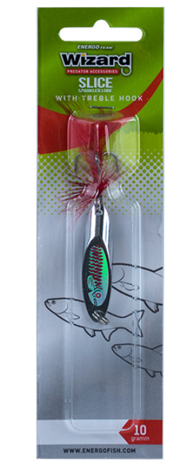 Wizard Slice lepel met kunstaasvlieghaak - Het kunstaas heeft een speciale gesneden zijdelingse vorm, die perfect gewonde aasvissen imiteert. Het binnendraaien is hetzelfde als bij andere lepels, langzaam en constant, maar kan ook met het 'vallende blad'-effect worden gebruikt, met pauzes, waardoor het eerder een prooi wordt voor snoeken. Continu, zelfs snel binnengehaald, is het een perfecte optie voor het vangen van roofblei.