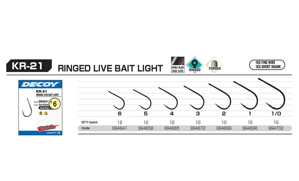 Beoordelingen Decoy KR-21 Round Live Bait Light 2 Füles Szakállas Egyágú Ragadozóhalas Horog 12db