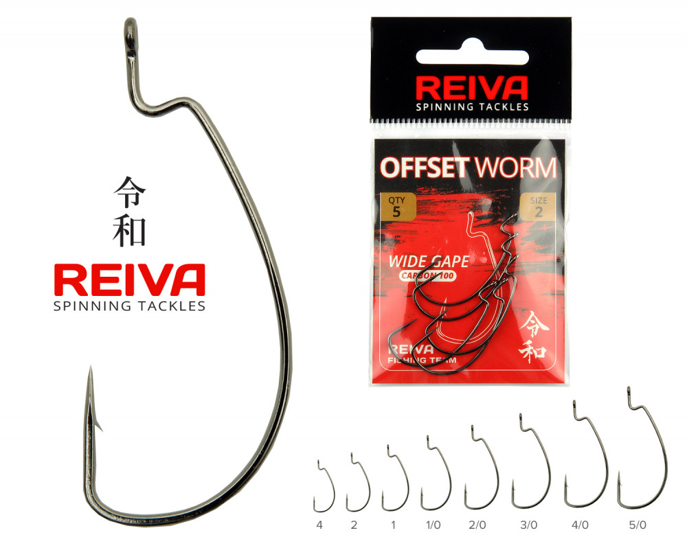 Reiva Offset Worm Zwart 4, 5 stuks/verpakking, haak met oog en weerhaak voor roofvis