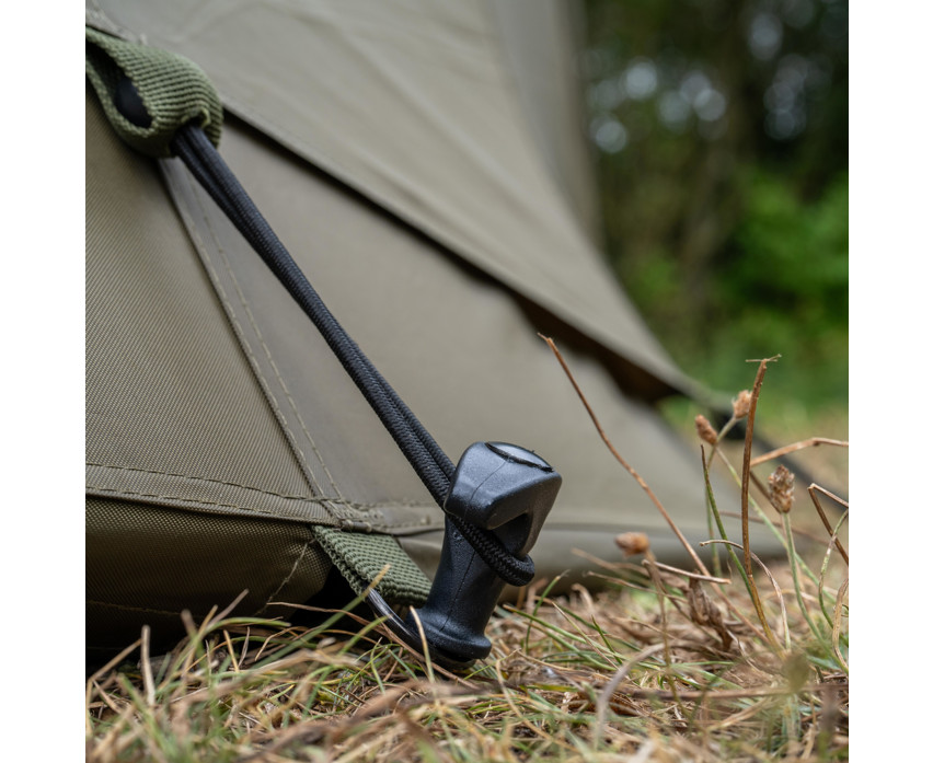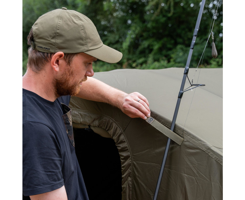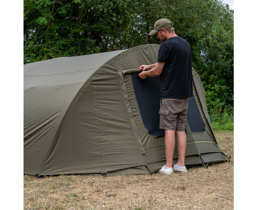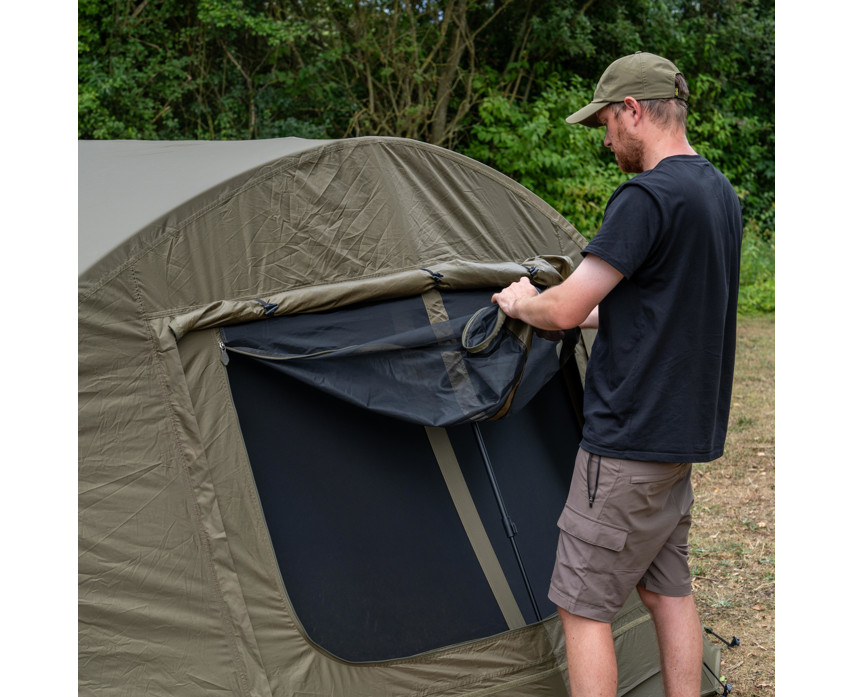Het voorste paneel is oprolbaar, waardoor de tent kan worden omgevormd tot een open voortent, wat vooral praktisch is op warmere dagen. De tweewegs deur, van boven en onder te openen, is ontworpen voor gebruik het hele jaar door, waardoor snelle toegang en regulering van de ventilatie mogelijk is. Aan de voorkant van de overwrap zijn ook twee hengelbanden geplaatst, die helpen bij het veilig en georganiseerd opbergen van vishengels.