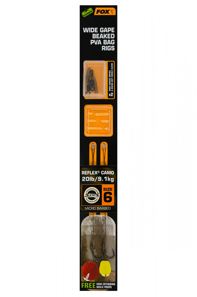 Fox EDGES™ Wide Gape Beaked PVA Bag Rigs 20lb Size 6 Brown & Green Voorgeknoopte haak gedetailleerde beschrijving