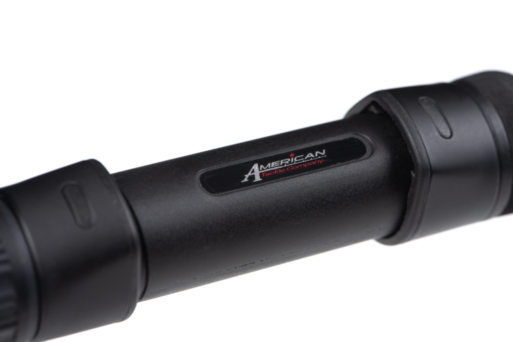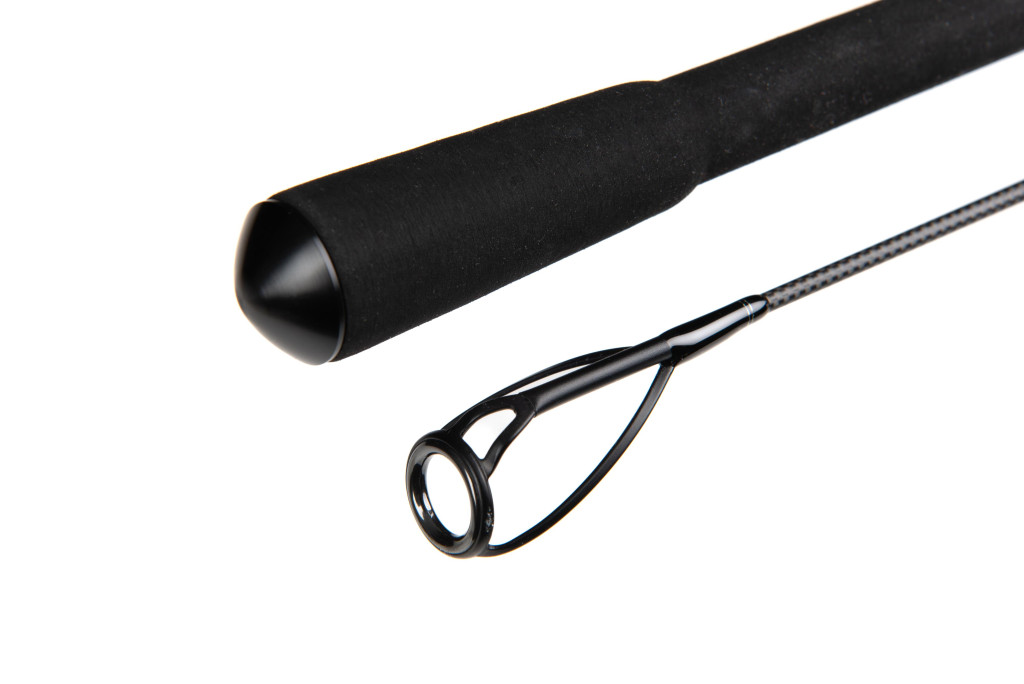 De uitrusting van de hengel omvat American Tackle Delta-Lite geleideogen van 50 mm tot 16 mm in een matzwarte uitvoering. De 50 mm startgeleideoog en de 30 mm tweede geleideoog zijn dubbel ondersteund, waardoor een stevige grip en soepele lijngeleiding gegarandeerd zijn. De molenhouder is een 18 mm DPS American Tackle model, eveneens in matzwart, dat de molen stabiel houdt, zelfs bij intensief gebruik. De zwarte kraag en einddop versterken de strakke uitstraling verder.