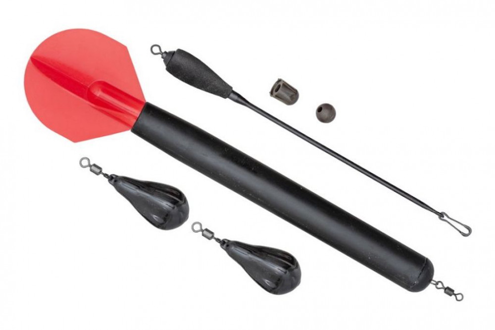 Volledig uitgeruste markeervlotter set, waarin naast de marker twee druppelvormige loden, rubberen stoppers en een afstandsdraad voor slibachtige bodems zijn opgenomen. Eén uiteinde van deze laatste is zodanig ontworpen dat het de lijn van de bodem tilt, waardoor deze niet samen met het lood in de modder zakt en de lijn er zonder weerstand doorheen kan glijden.