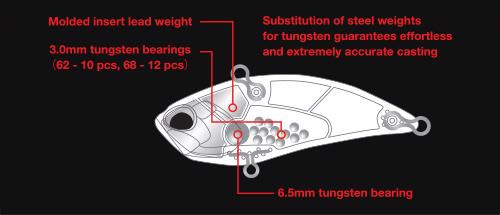 De vaste stalen kogels (6,5 mm x 1) en de vrij bewegende rammelende kogels (3,0 mm x 12) zijn vervangen door wolfraamkogels van dezelfde grootte. Daarnaast is een gevormd vast gewicht toegevoegd aan de kop van het kunstaas, waardoor het totale gewicht met 5 g is toegenomen in vergelijking met het standaardmodel.