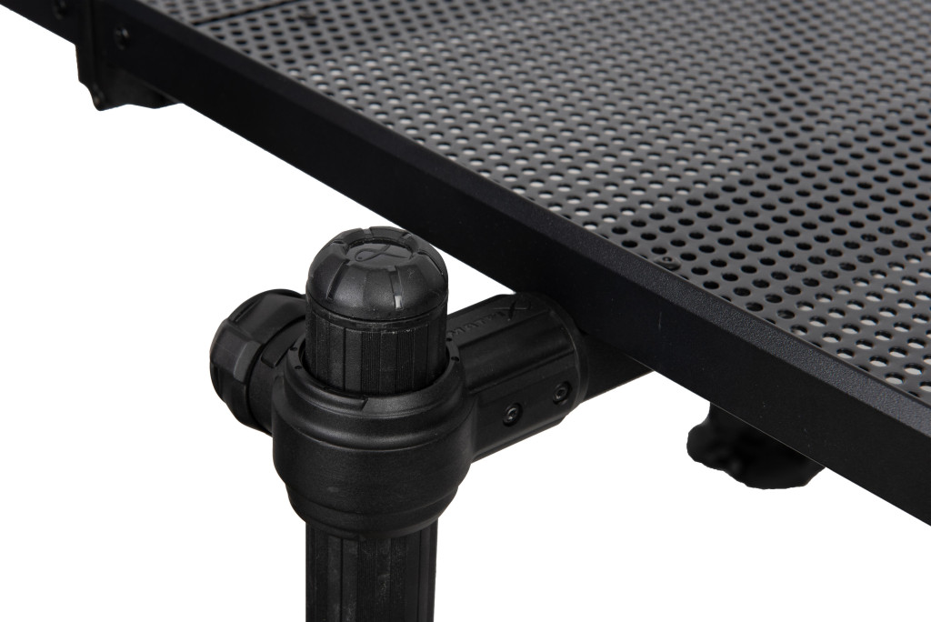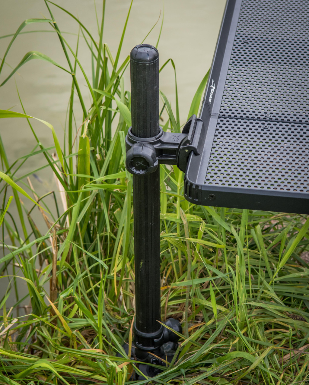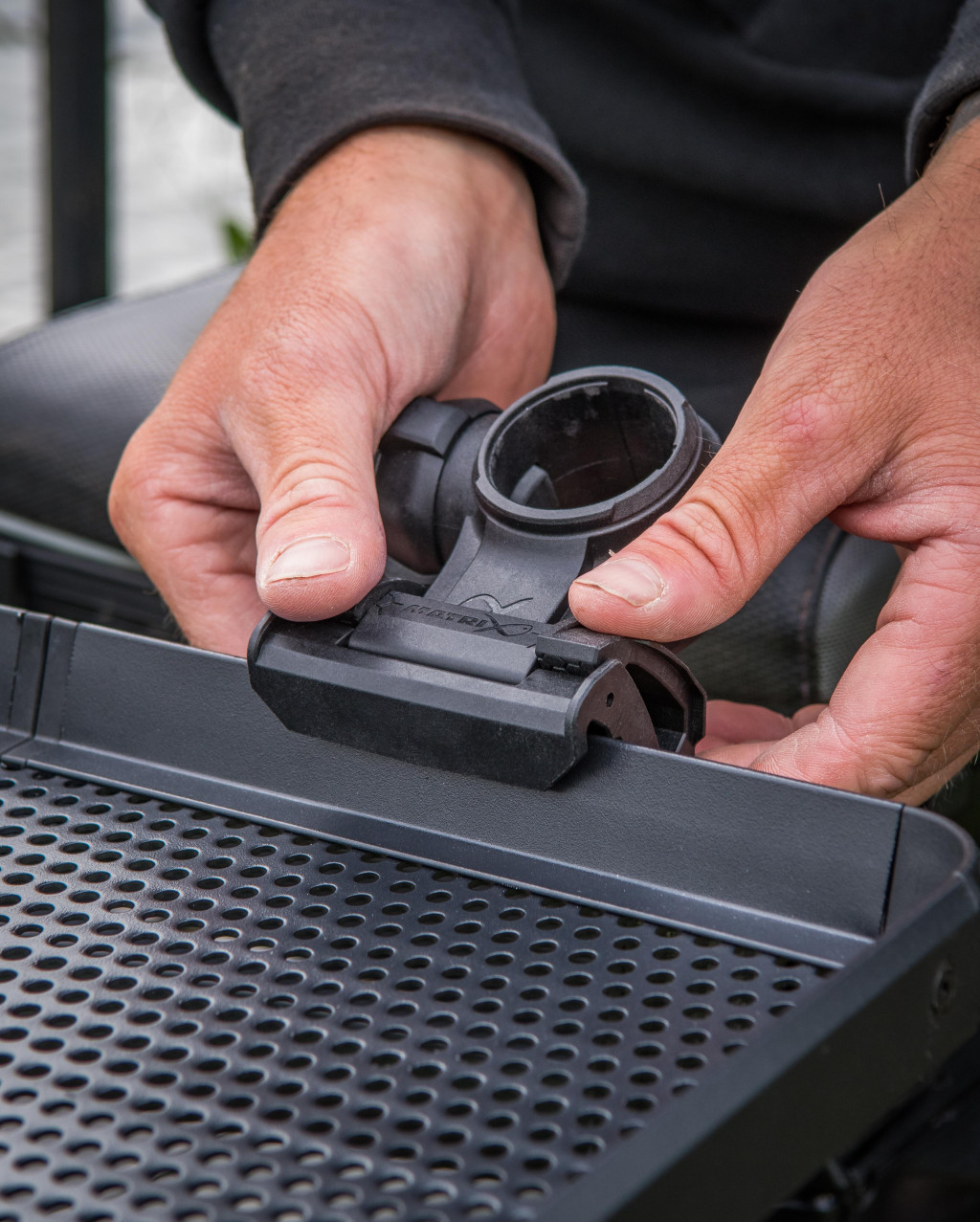 De adapter is zo ontworpen dat hij op de extra sterke buitenrand van de Matrix zijtafels kan worden geklikt. De bevestiging kan in elke positie rond de rand worden uitgevoerd, zodat de visser de plaatsing kan aanpassen aan zijn eigen behoeften. Dit is bijzonder handig als je een steunpoot aan de tafel wilt toevoegen, aangezien de adapter perfect geschikt is om deze stabiel te bevestigen.