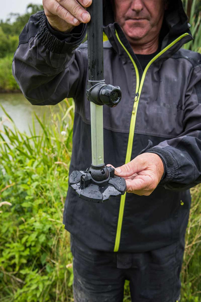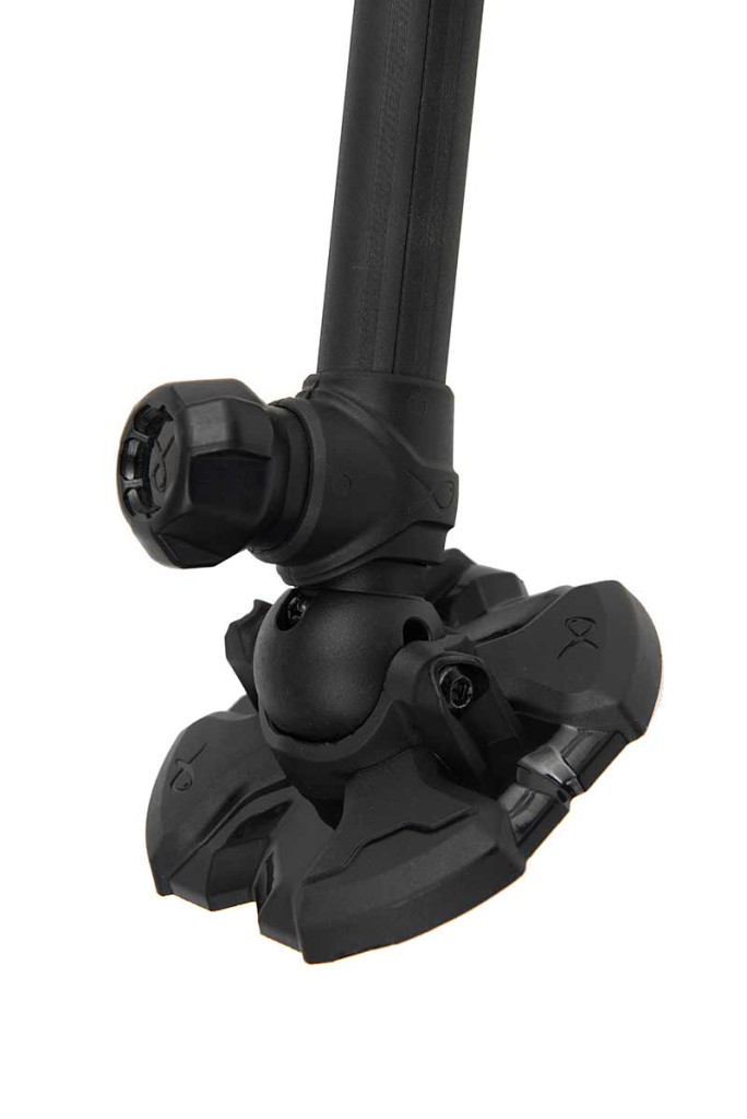 De poot is voorzien van schroefdoppen die een stevige bevestiging bieden, terwijl de grote, 360° draaibare modderpoten maximale stabiliteit bieden op oneffen of zachte ondergrond. Deze modderpoten verdelen het gewicht, zodat de wedstrijdvistafel niet wegzakt, wat vooral belangrijk is in moerassige of modderige omgevingen.