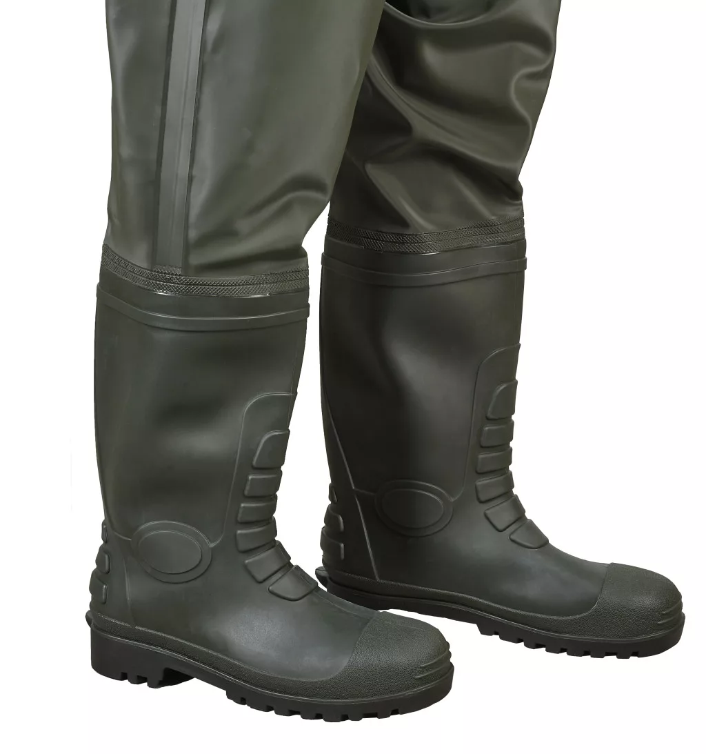 Het basismateriaal van de broek is een speciale, hoge dichtheid PVC- en polyester mix, die tegelijkertijd scheurweerstand en volledige waterdichtheid garandeert. Het oppervlak van het materiaal is bestand tegen doornen en scherpe stenen die op visplekken voorkomen. Het laarsgedeelte is direct aan de broek gelast, zodat er geen zwakke punten zijn waar water kan binnendringen. De naden zijn gemaakt met hoogfrequent lassen, wat de meest duurzame verbindingstechnologie is die op de markt verkrijgbaar is.