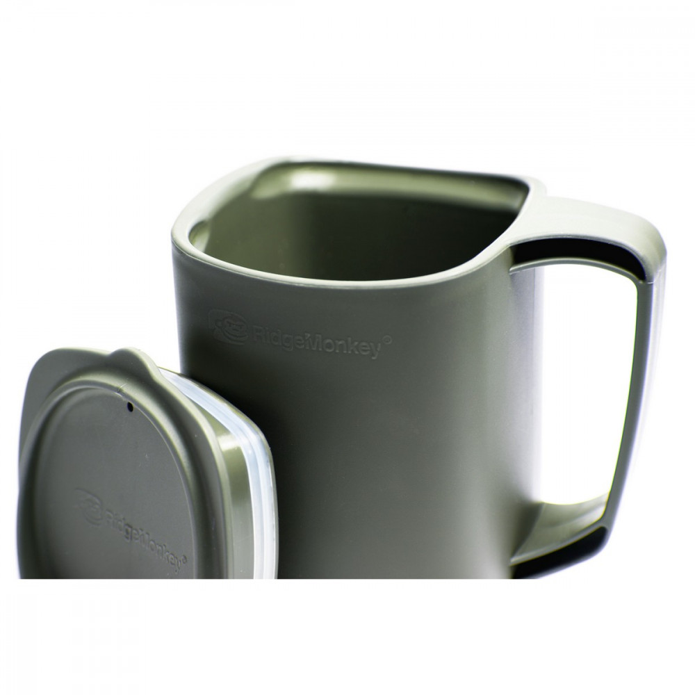 Ridgemonkey Thermo Mug Gunmetal Green dubbelwandige mok - Houd thee en koffie warm aan de waterkant, zelfs langer dan een uur. Dankzij het deksel van de mok kun je je drankje gerust buiten laten staan zonder dat insecten erin kruipen. Dankzij de vierkante vorm is het ruimtebesparend te vervoeren.