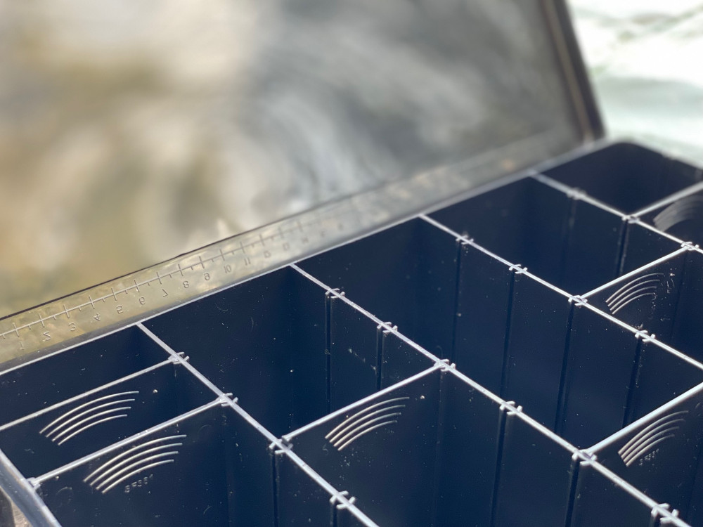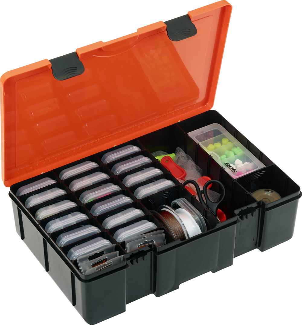 Opbergdoos voor haakaas en kleine artikelen, in oranje. Praktische plastic opbergdoos, waarin alle accessoires en andere kleinere benodigdheden kunnen worden opgeborgen. De tacklebox bevat geen accessoires!Afmetingen: 35,5x23x9cm