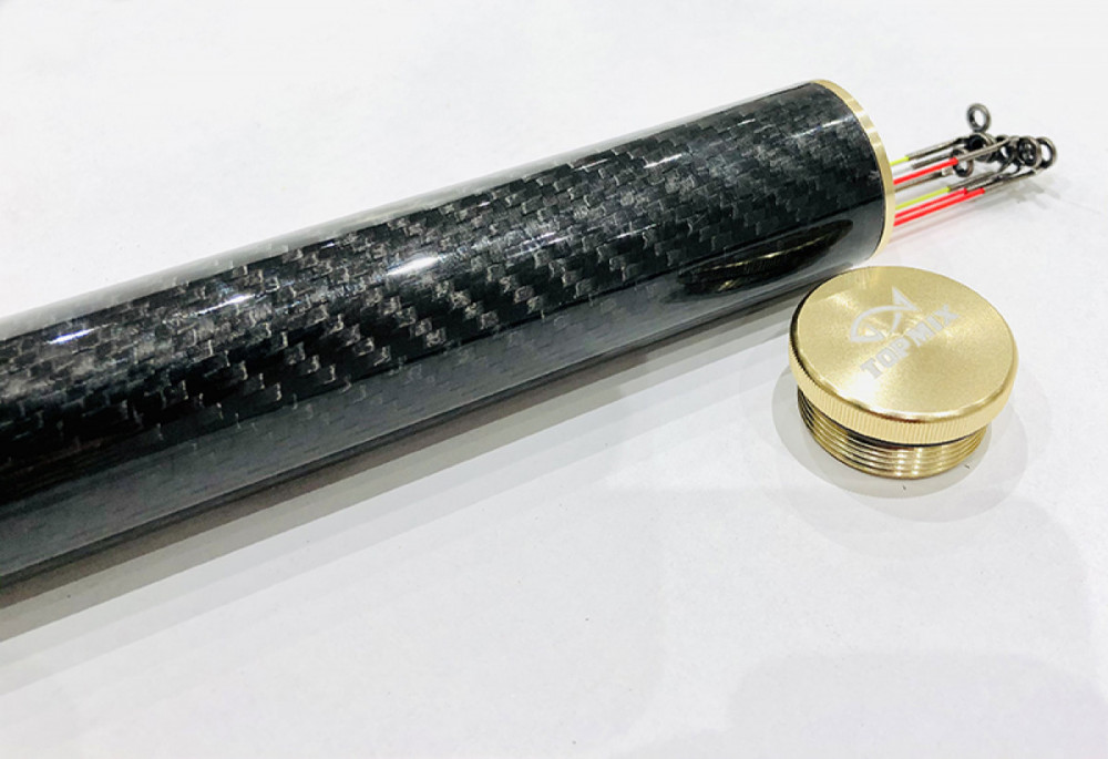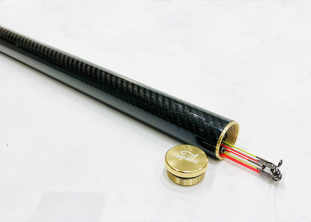 Carbon feeder top houder. Uniek, verfijnd ontwerp, een zeer sterke, meerlaagse carbon buis voor veilige opslag van feederhengeltoppen, met schroefdraad metalen einddoppen aan beide uiteinden.