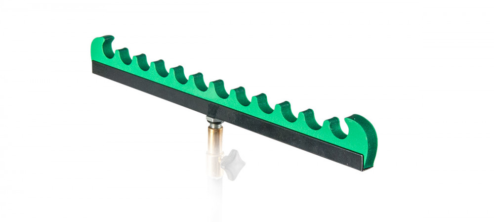 Laten we eens nadenken waar we onze hengel plaatsen als we net voer willen katapulteren. In het ergste geval op de grond, of in een hengelsteun naast ons. Het is echter wetmatig dat dan de aanbeet komt, die we al gemist hebben, omdat de uitrusting niet binnen handbereik was. Om de meeste vis te vangen, kiezen we een hoogwaardige, getande hengelsteun. Zittend in onze visstoel plaatsen we het handvat van de hengel op onze schoot en het voorste deel in de Feeder-Match hengelsteun, die naast het bieden van een stabiele houvast, het oppervlak van de hengel beschermt tegen beschadigingen en krassen. Een ander voordeel is dat bij gebruik van feederuitrusting we de spanning van onze lijn kunnen aanpassen door de hengel te verplaatsen, zonder de molen te draaien. Tip: Bij match vissen stellen we onze hengelsteun zo af dat de top van de hengel het water raakt, zodat we zelfs bij harde wind onze lijn gemakkelijker onder water kunnen houden, wat voorkomt dat het tuig wegdrift.